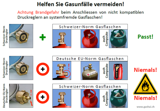 Es sind keinesfalls deutsche Gasanschlüsse mit schweizerischen Anschlüssen zu kombinieren!